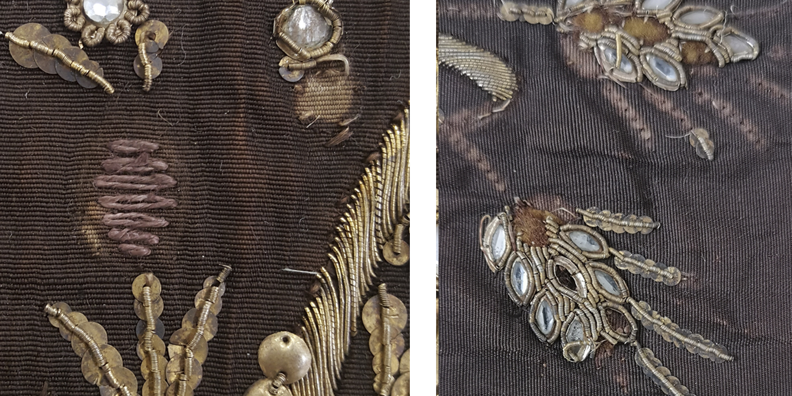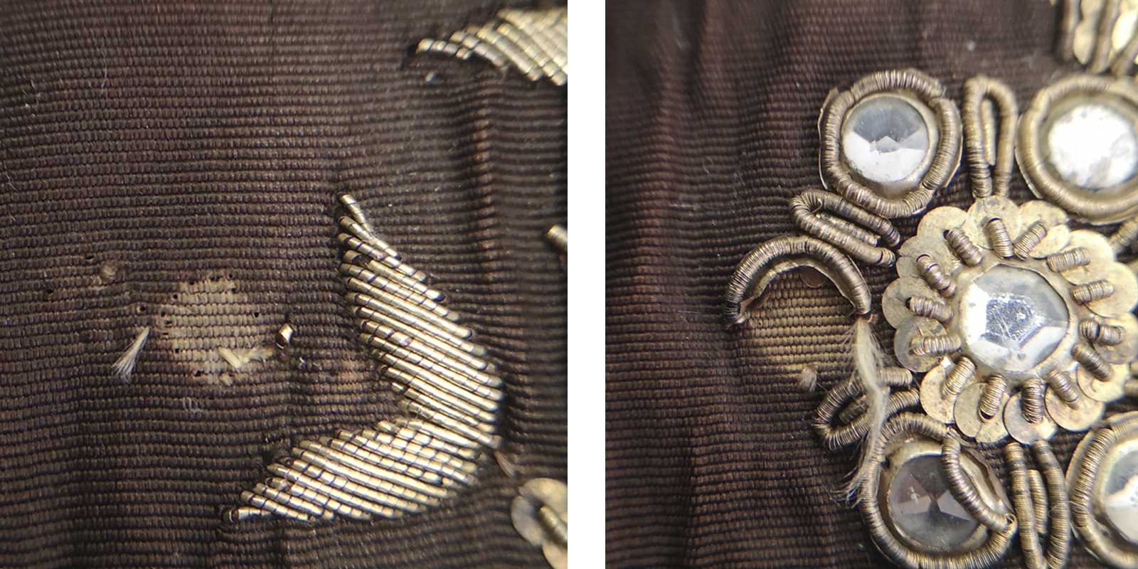 - Por otro lado, los cordoncillos y fieltros amarillos que conforman la preparación en basto de la guarnición bordada y que quedaban a la vista por haberse perdido los elementos que los ocultaban, mostraban en sus superficies restos de tinte marrón, siendo estos muy superficiales a la par que poco homogéneos (Fig. 9 y 10). Sin embargo, algunos puntos en los que las pérdidas no eran completas si no que los elementos estaban parcialmente descohesionados, permitían observar como los fieltros y cordones carecían de esa tonalidad marrón, lo que, sin duda, servía de apoyo a la hipótesis planteada.