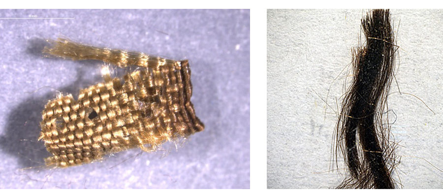 Para su realización fue necesario tomar dos muestras de los soportes textiles, una de las zonas más preservadas (M1), donde predominaba el color amarillo y otra de las que mostraban la tonalidad marrón intensa (M2)