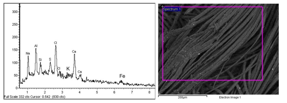 Ambas muestras fueron sometidas a un análisis de Cromatografía en Capa Fina (TLC), que permitió identificar el colorante empleado en el tinte de los soportes. En el caso de la M1, los análisis determinaron que se trataba de un colorante amarillo, de origen natural y tipo flavonoide, que se ajustaba al patrón del fustete (Cotinus coggygria Scop) arbusto de cuyos tallos y hojas se obtiene el colorante. En este caso, se realizó un segundo análisis para la caracterización química de los mordientes empleados en la tinción, concretamente una Microscopía Electrónica de Barrido con Microanálisis de rayos –X (SEM/EDX) el cual determinó la presencia de Alumbre potásico (KAI (SO4)2.12H2O) y Sulfato de Hierro (Fig. 11).