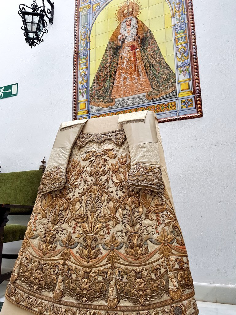 La intervención de la saya ha permitido recuperar el esplendor de una excepcional pieza bordada en hilo de oro y sedas de colores sobre tejido de brocado de plata en el taller de Esperanza Elena Caro en 1965 con diseño de Fernando Marmolejo Camargo.