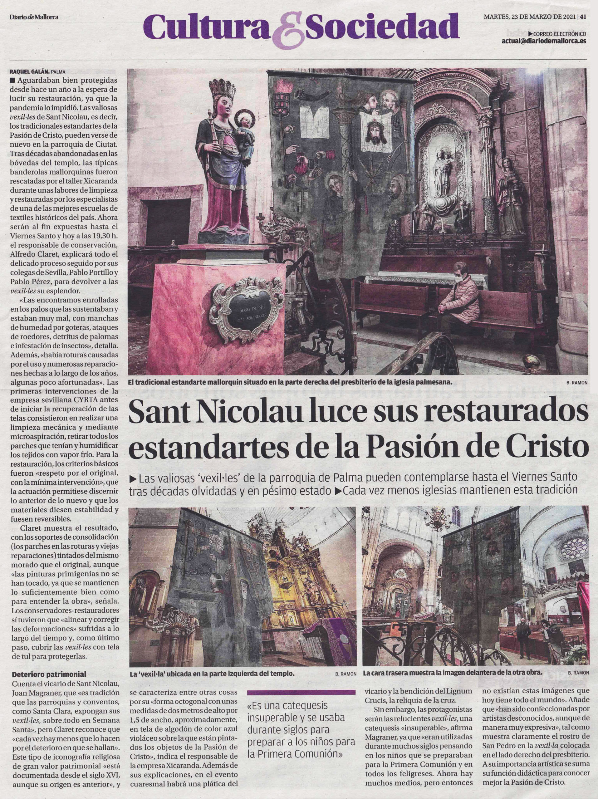 Este martes, 23 de marzo, el Diario de Mallorca ha publicado un interesante reportaje de la restauración que realizamos en CYRTA sobre las dos Vexil-les o Estandartes de la Pasión, pertenecientes a la Iglesia de Sant Nicolau de Palma (Mallorca), y que serán expuestas hasta el Viernes Santo.