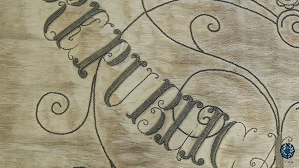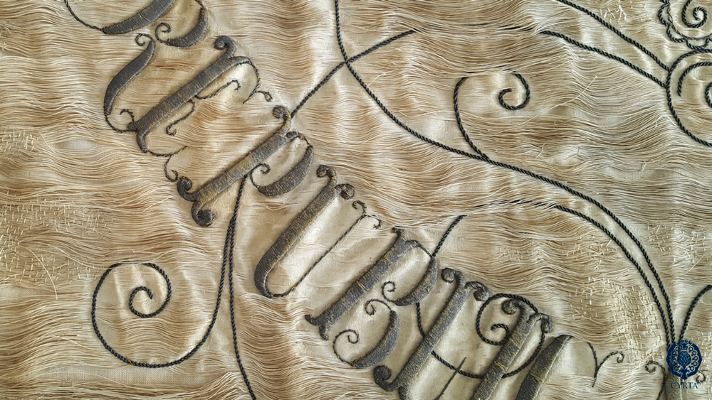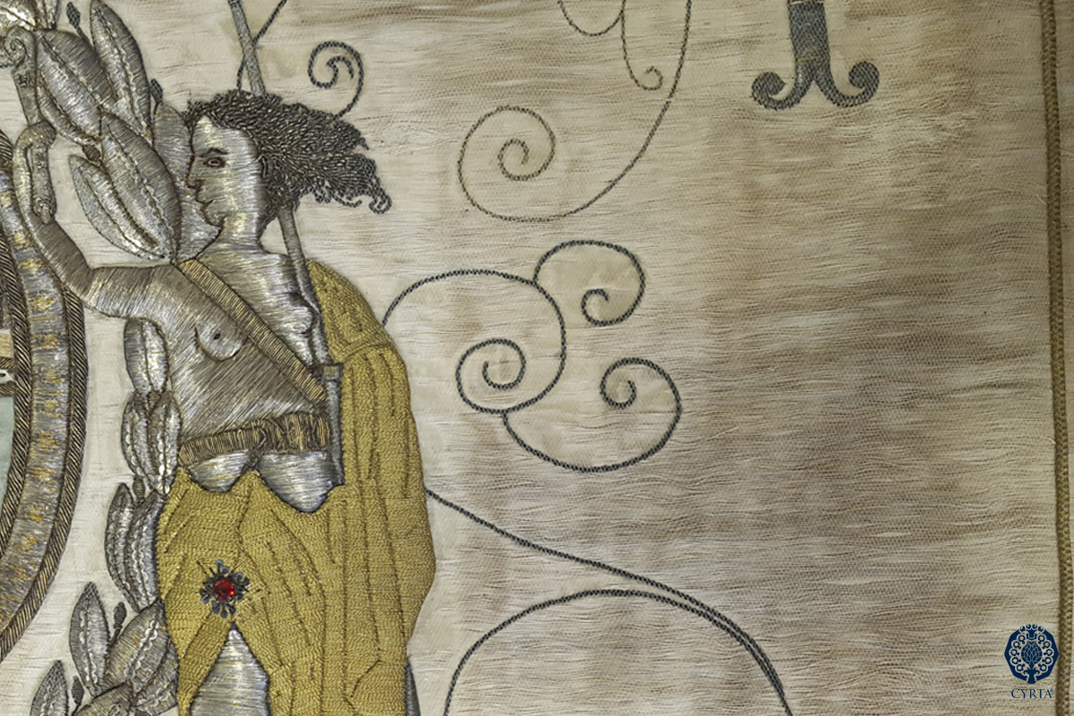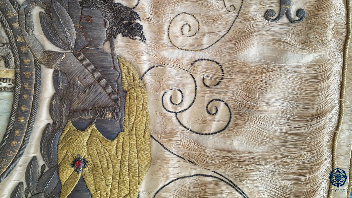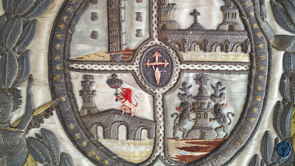 - Técnica: Bordado en hilo metálico sobre tejido de raso, con trama de algodón y urdimbre de seda.