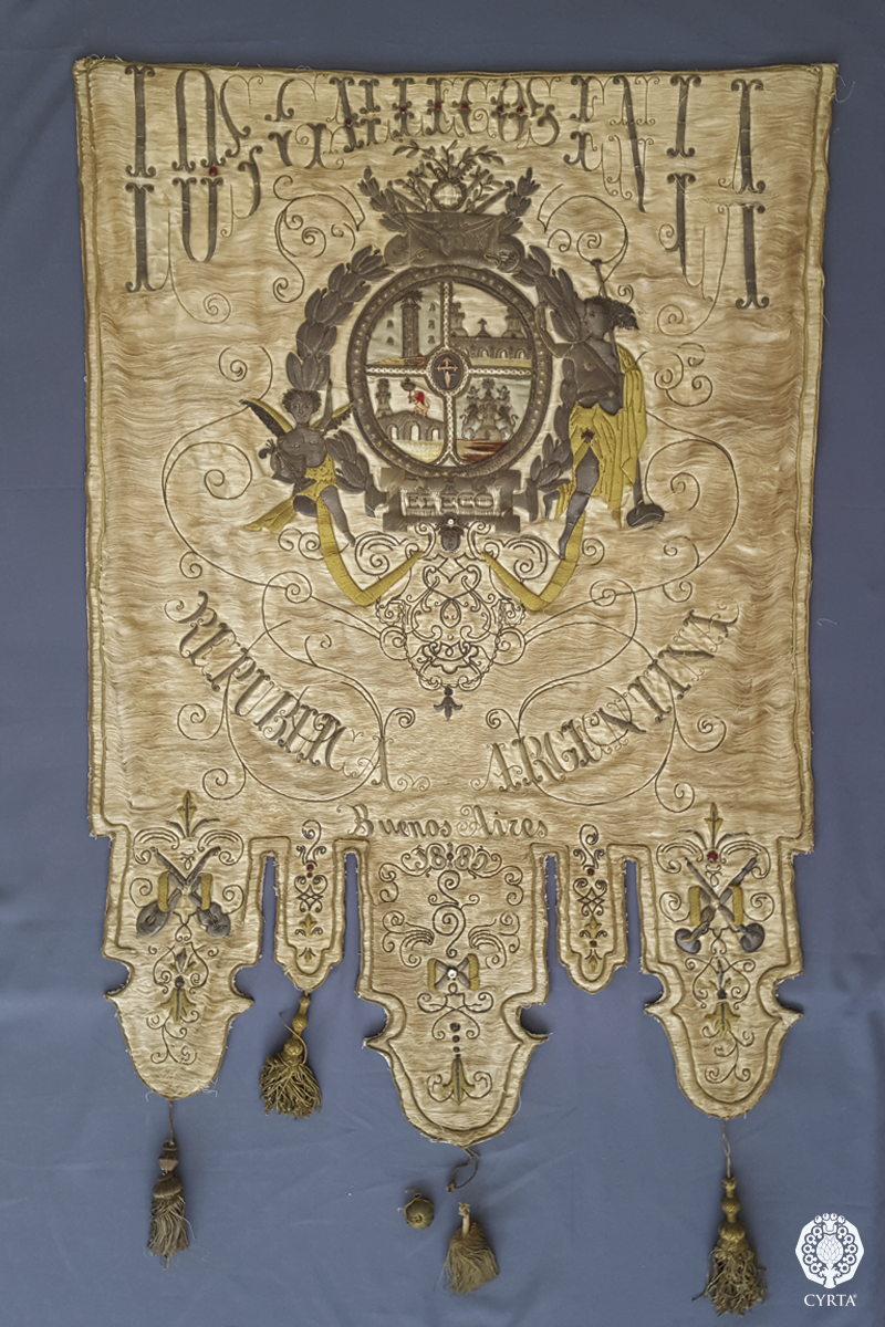 - TRATAMIENTOS: Documentación fotográfica, desmontaje de forro, microaspirado, tratamiento sobre restos de hongos, humidificación general controlada, limpieza físico-química de hilos metálicos, consolidación del tejido principal, encapsulado total de la bandera, realización de nuevas pletinas de tela para su colocación en vitrina, forrado.