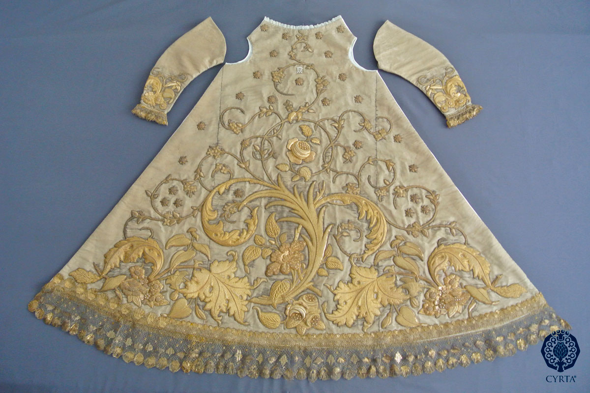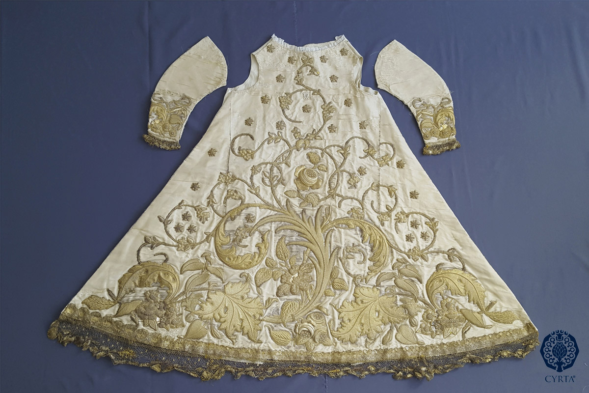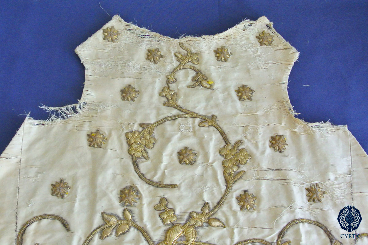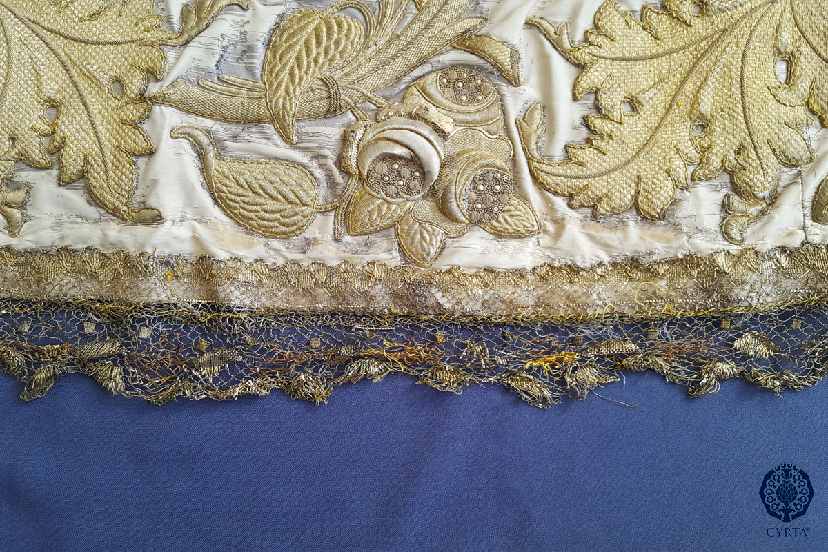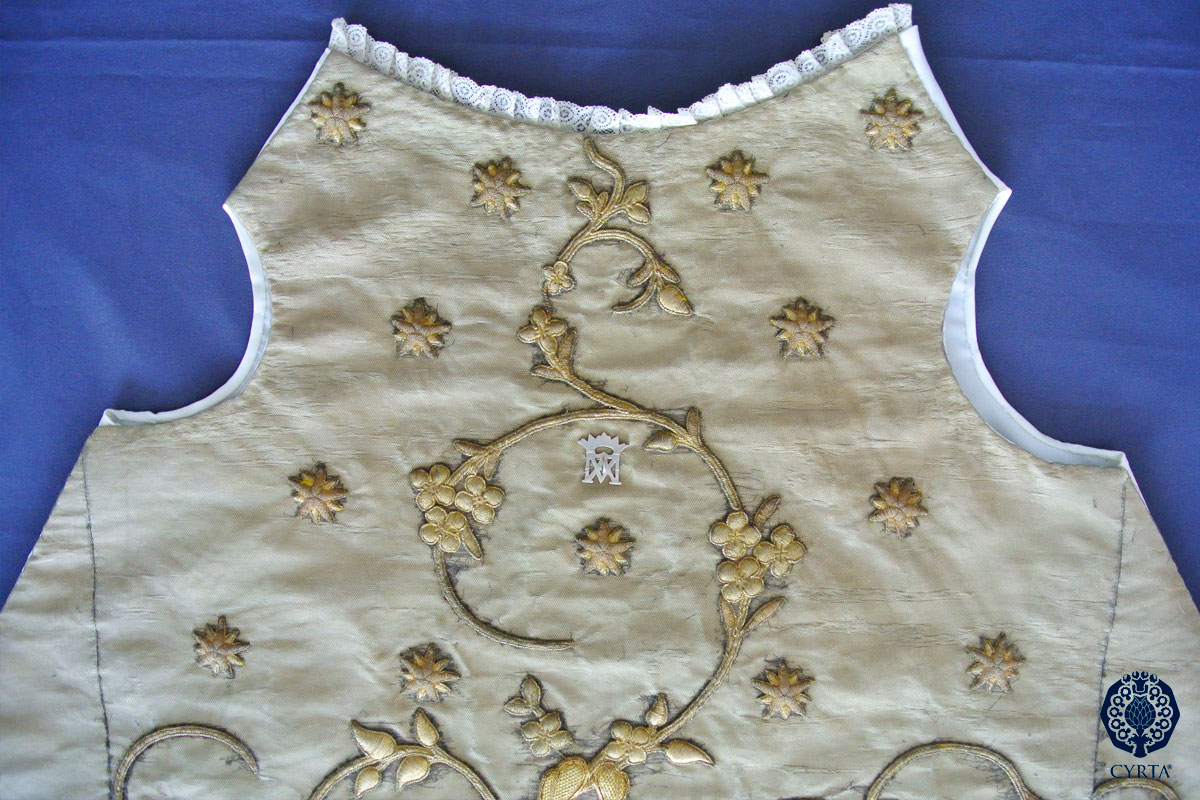 - TRATAMIENTOS: Documentación fotográfica, mapa de daños, análisis hilos metálicos, desmontaje de forro, eliminación de intervenciones anteriores, microaspirado, tratamiento en zonas con adhesivo, limpieza físico-química de la ornamentación bordada y encajes decorativos, humectación y alineado del tejido y de los encajes metálicos, limpieza por inmersión acuosa de los encajes de algodón de cuello y puños, consolidación del tejido, encapsulado total, colocación de encajes, colocación de nuevo forro.