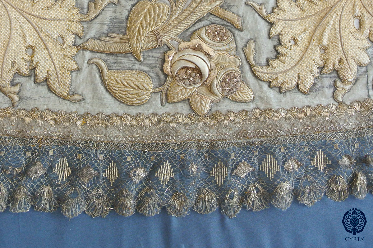 - Técnica: Bordado a realce con hilo metálico dorado sobre terciopelo. Pasado a nuevo soporte de lamé de plata (fecha desconocida)